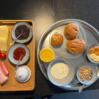 - Een tweepersoonsbed en een eettafel met twee stoelen
